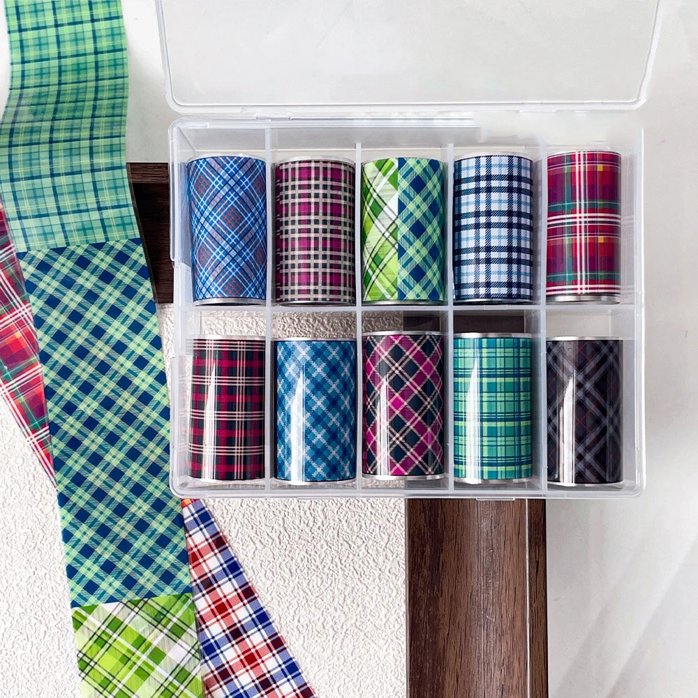 Mit dem 10er Set Transferfolien im trendigen Plaidmuster bringst du stylische Karodesigns ganz einfach auf deine Nägel! Ob klassisch in Rot und Schwarz, elegant in Beige oder modern in bunten Farbkombinationen – die vielseitigen Muster lassen sich perfekt zu jedem Look kombinieren. Die hauchdünnen Folien lassen sich mühelos auftragen und verleihen deinem Nageldesign in Sekunden einen professionellen, gleichmäßigen Look.